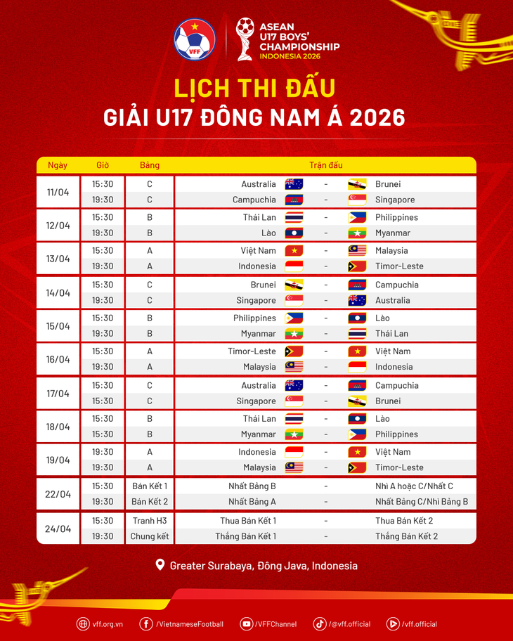 U17 Việt Nam sẽ có trận đấu ra quân gặp U17 Malaysia vào ngày 13-4. Tiếp đó lần lượt đụng độ U17 Timor-Leste (ngày 16-4) và U17 Indonesia (ngày 19-4). Ba đội đứng đầu và một đội nhì bảng có thành tích tốt nhất sẽ giành quyền vào bán kết.