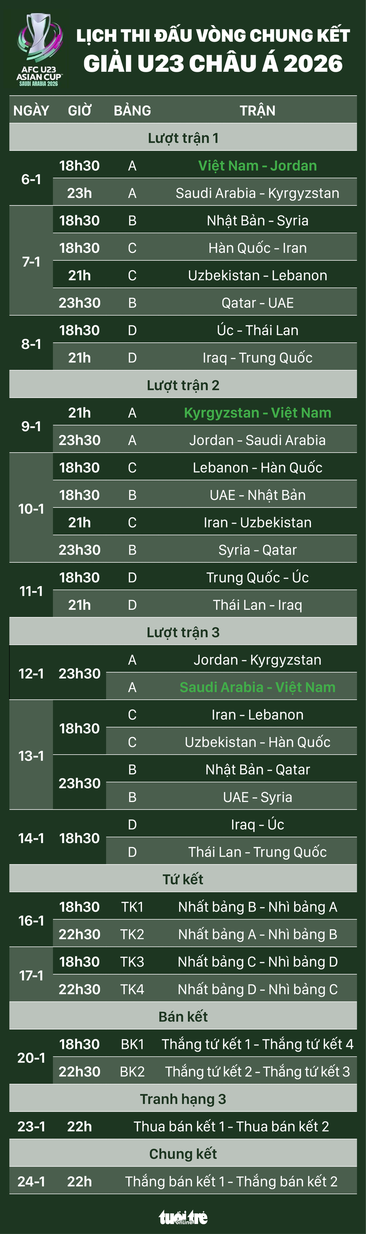 Theo lịch thi đấu, U23 Việt Nam sẽ lần lượt đối đầu với Jordan (lúc 18h30 ngày 6-1), Kyrgyzstan (21h ngày 9-1) và Saudi Arabia (23h30 ngày 12-1).