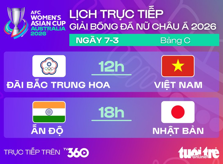Ngày 7-3, Asian Cup nữ 2026 tiếp tục với hai trận đấu ở bảng C: Đài Bắc Trung Hoa gặp Việt Nam (12h) và Ấn Độ đụng độ Nhật Bản (18h). Toàn bộ trận đấu sẽ được truyền trình trực tiếp trên hệ thống của TV360.