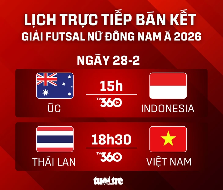 Trận bán kết giữa tuyển futsal nữ Việt Nam và Thái Lan sẽ được trực tiếp trên TV360. Tuổi Trẻ Online sẽ trực tuyến trận đấu này, mời bạn đọc đón theo dõi.
