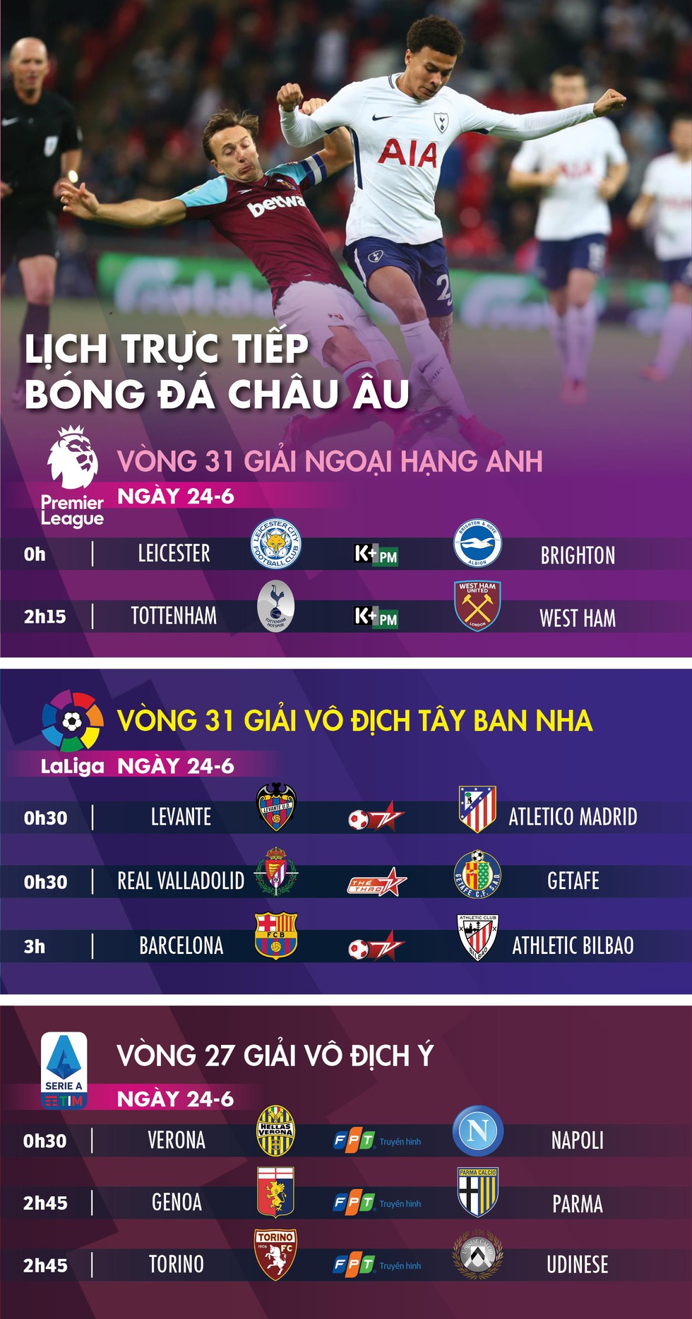 Lịch trực tiếp bóng đá châu Âu ngày 24-6: Tottenham, Barca xuất trận