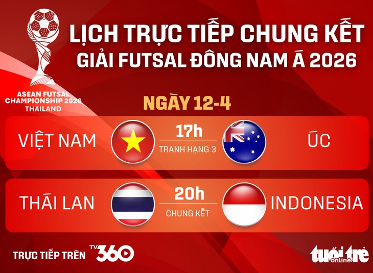Ngày 12-4, Giải vô địch futsal Đông Nam Á 2026 sẽ diễn ra ngày thi đấu cuối cùng. Và tuyển futsal Việt Nam sẽ đối đầu Úc ở trận tranh hạng ba vào lúc 17h.