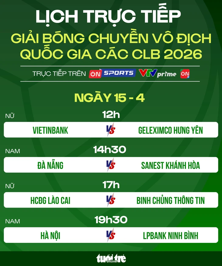 Đây chính là màn so tài đáng xem nhất trong ngày 15-4. Binh chủng Thông tin vẫn là một trong những ứng viên hàng đầu, dù phong độ có phần chưa ổn định. Trong khi đó, HCĐG Lào Cai đang "hồi sinh" từ khi ngôi sao Bích Thủy trở về từ Nhật Bản. Có thể đây là một cặp đấu "một chín một mười" vào lúc này.