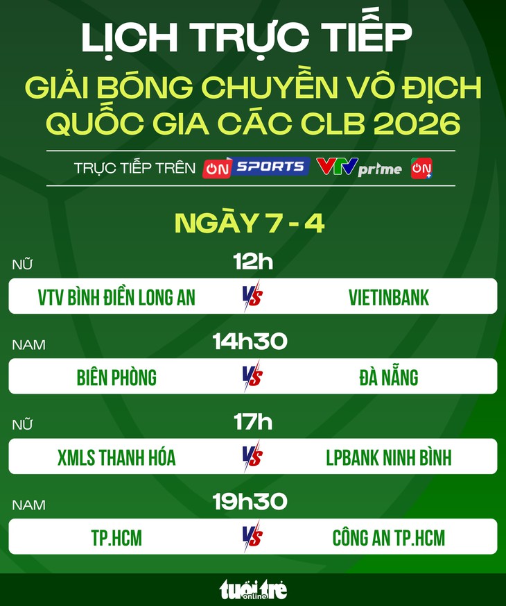Lịch trực tiếp Giải bóng chuyền vô địch quốc gia các CLB ngày 7-4 - Đồ họa: AN BÌNH