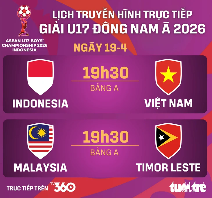 19h30 ngày 19-4 sẽ diễn ra lượt đấu cuối bảng A Giải vô địch U17 Đông Nam Á 2026 với hai cặp đấu giữa: Việt Nam gặp Indonesia và Malaysia chạm trán Timor-Leste. Cả hai trận được truyền hình trực tiếp trên hệ thống của TV360.