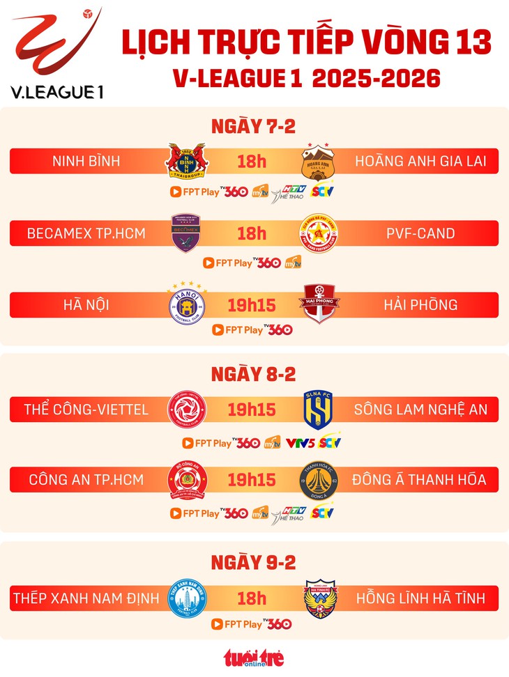 Trận đấu muộn nhất vòng 13 là cuộc chiến giữa CLB Thép Xanh Nam Định với Hồng Lĩnh Hà Tĩnh, diễn ra vào lúc 18h ngày 9-2. Đội bóng thành Nam đang rất cần điểm để thoát khỏi nhóm cuối bảng.