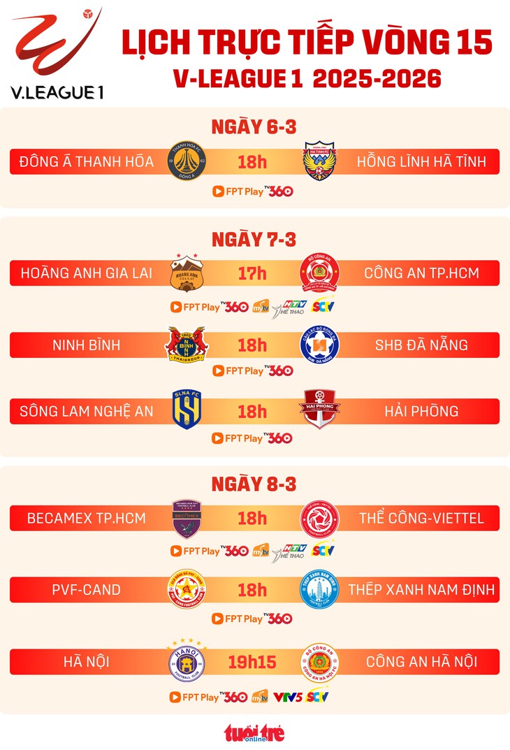 Ngày 7-3, vòng 15 V-League 2025-2026 sẽ diễn ra ba trận đấu: Hoàng Anh Gia Lai gặp Công An TP.HCM (lúc 17h), CLB Ninh Bình đối đầu SHB Đà Nẵng và Sông Lam Nghệ An chạm trán Hải Phòng cùng vào lúc 18h.