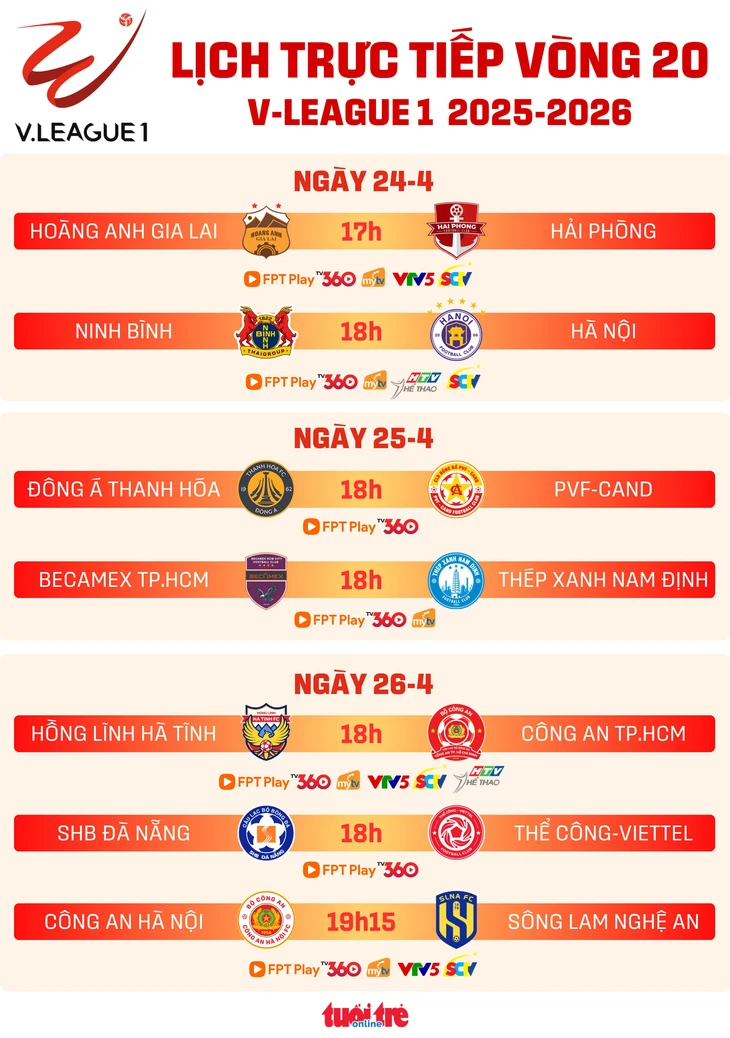 18h ngày 24-4, CLB Ninh Bình chạm trán Hà Nội trong khuôn khổ vòng 20 V-League 2025-2026. Cuộc đấu sẽ quyết định top 3 của bảng xếp hạng.
