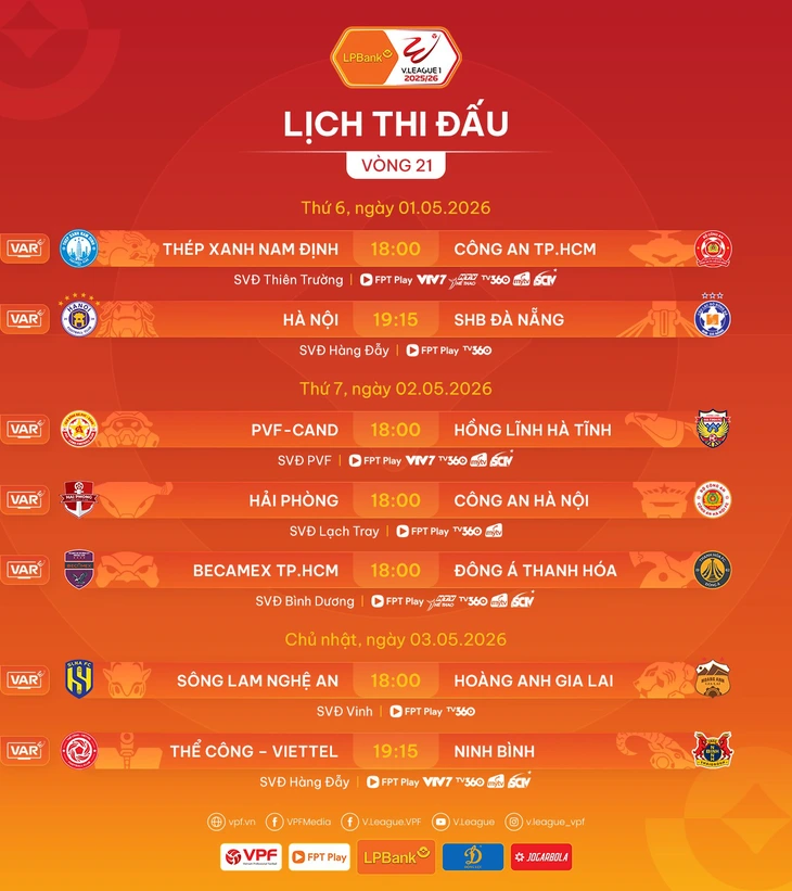 Vòng 21 V-League 2025-2026 sẽ bắt đầu với hai trận đấu ngày 1-5: Thép Xanh Nam Định gặp CLB Công An TP.HCM (18h) và Hà Nội chạm trán SHB Đà Nẵng.