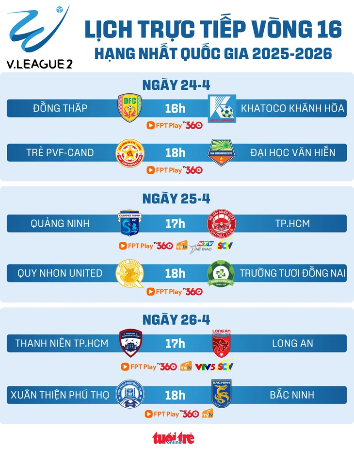 Ngoài ra, vòng 16 Giải hạng nhất còn có cặp đấu đáng chú ý giữa Quy Nhơn United và Trường Tươi Đồng Nai vào lúc 18h ngày 25-4.