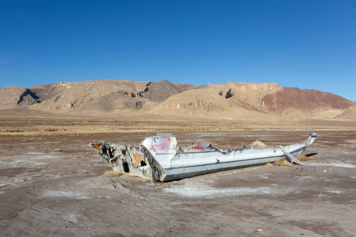 Những mảnh vỡ của một chiếc thuyền trên lòng hồ Urmia ở tây bắc Iran đã bị khô cạn, ngày 19-12-2025 - Ảnh: AFP