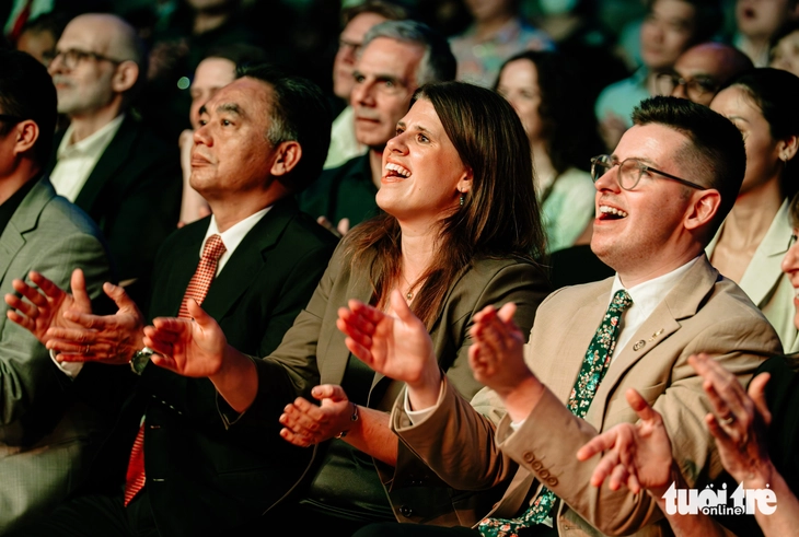 Từ trái sang phải: Phó chủ tịch Thường trực UBND TP.HCM Nguyễn Lộc Hà; Tổng lãnh sự Anh tại TP.HCM Alexandra Smith; Ủy viên Hội đồng thành phố Liverpool, Thành viên Nội các về Y tế, Phúc lợi và Văn hóa Harry Doyle cùng các đại biểu, khách mời tham dự chương trình tối 28-1 - Ảnh: THANH HIỆP