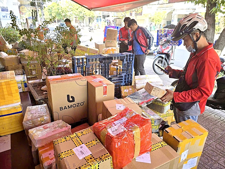 Đơn hàng tăng đột biến, shipper tại các bưu cục hoạt động full công suất để kịp chuyển hàng cho khách - Ảnh: CÔNG TRUNG