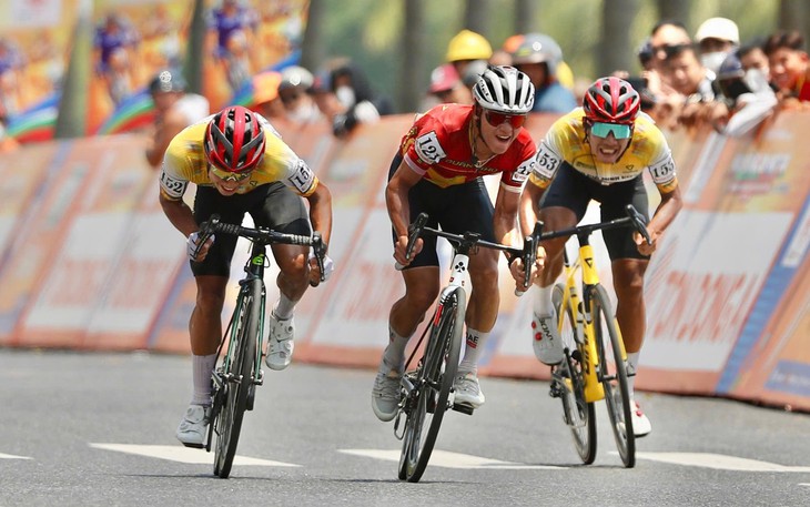 Phạm Lê Xuân Lộc (áo đỏ) đang nắm giữ áo cam - Ảnh: CYCLING NEWS
