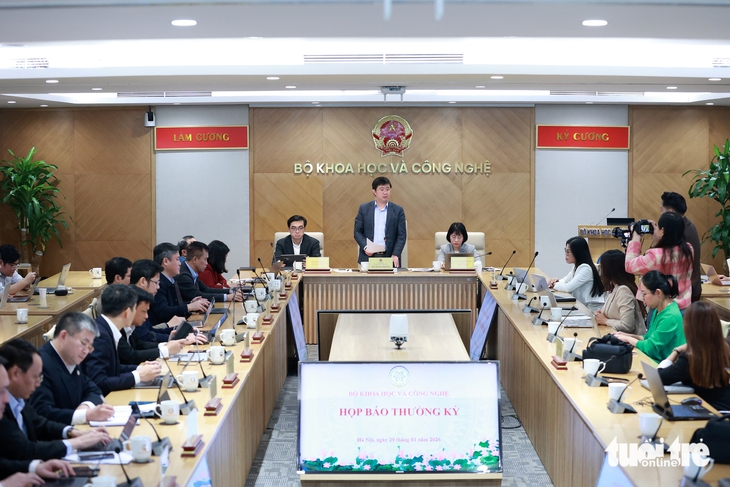 Toàn cảnh cuộc họp báo thường kỳ của Bộ Khoa học và Công nghệ do Thứ trưởng Bùi Hoàng Phương chủ trì - Ảnh: CHÍ HIẾU