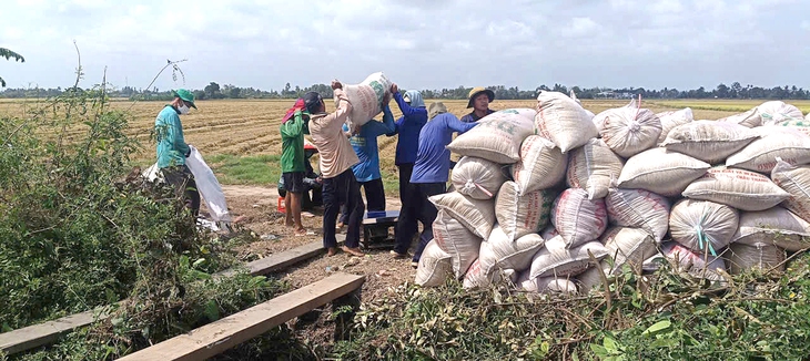 Thương lái thu mua lúa ST25 trong vụ đông xuân 2025 - 2026 tại xã Châu Thành, tỉnh An Giang - Ảnh: BỬU ĐẤU