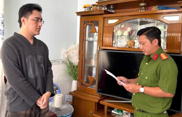 Cơ quan cảnh sát điều tra Công an thành phố Cần Thơ tống đạt quyết định và lệnh bắt tạm giam đối với Diệp Văn Vĩnh - Ảnh: C.A.