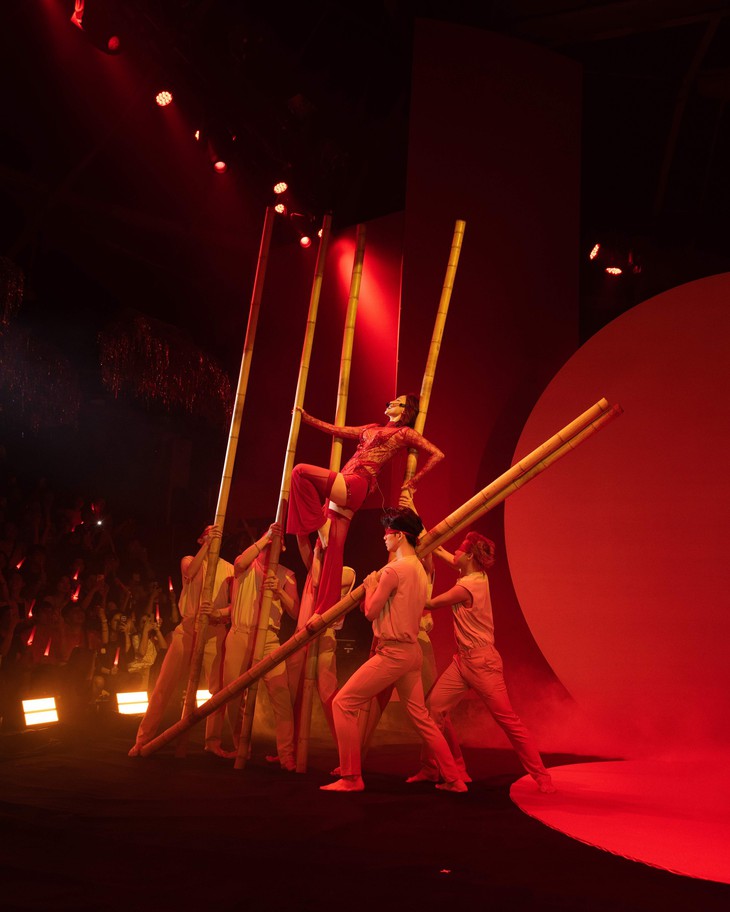 Tóc Tiên "biến hình" liên tục trong liên khúc 3 Nàng, tái hiện sân khấu Chân Ái cùng Đồng Ánh Quỳnh và Vũ Ngọc Anh với loạt kỹ thuật biểu diễn xiếc phức tạp.