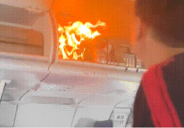 Bức ảnh cũng cho thấy khói đen bao trùm khoang hành khách, trong khi ít nhất một hành khách đang cố gắng dập lửa.