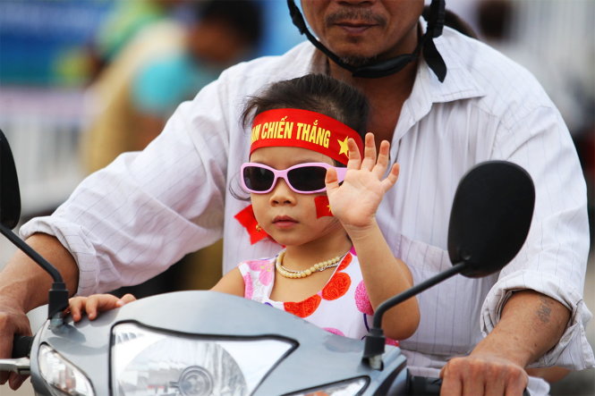 | Một CĐV "nhí" được cha chở đến sân chuẩn bị xem trận M.C gặp tuyển VN. Ảnh: Nguyễn Khánh |