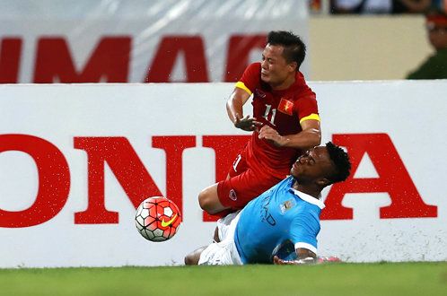 VAAOOO, 1-8 cho VN. Văn Quyết ghi bàn. Phút 90, Chí Công bấm bóng vào trung lộ, Văn Quyết cài người trung vệ trẻ Horsfield, giành được lợi thế, thoát xuống tâng bóng qua đầu thủ môn Caballero, ghi bàn.