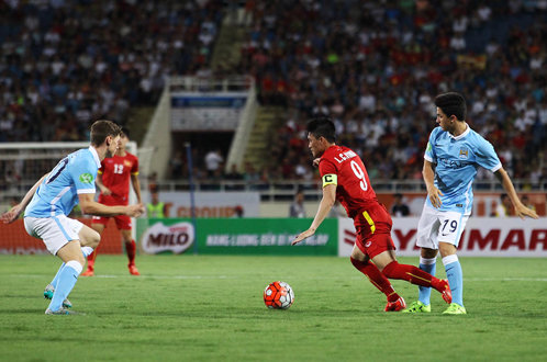 | Văn Quyết tranh bóng giữa vòng vây các cầu thủ M.C - Ảnh: Nam Khánh |