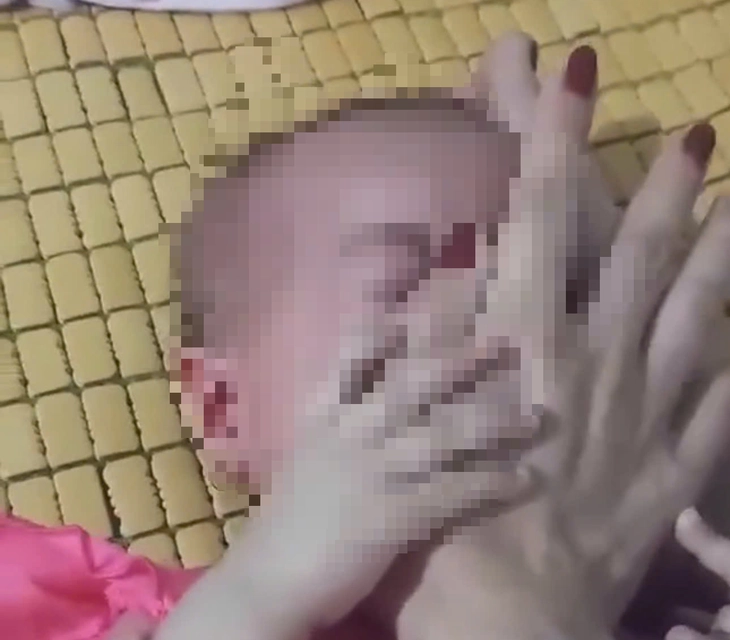Trước đó, đoạn clip lan truyền trên mạng xã hội cho thấy người phụ nữ nhiều lần bóp mạnh vùng mặt, mũi, miệng bé gái đang nằm trên giường, khiến cháu giãy giụa, khóc lớn.
