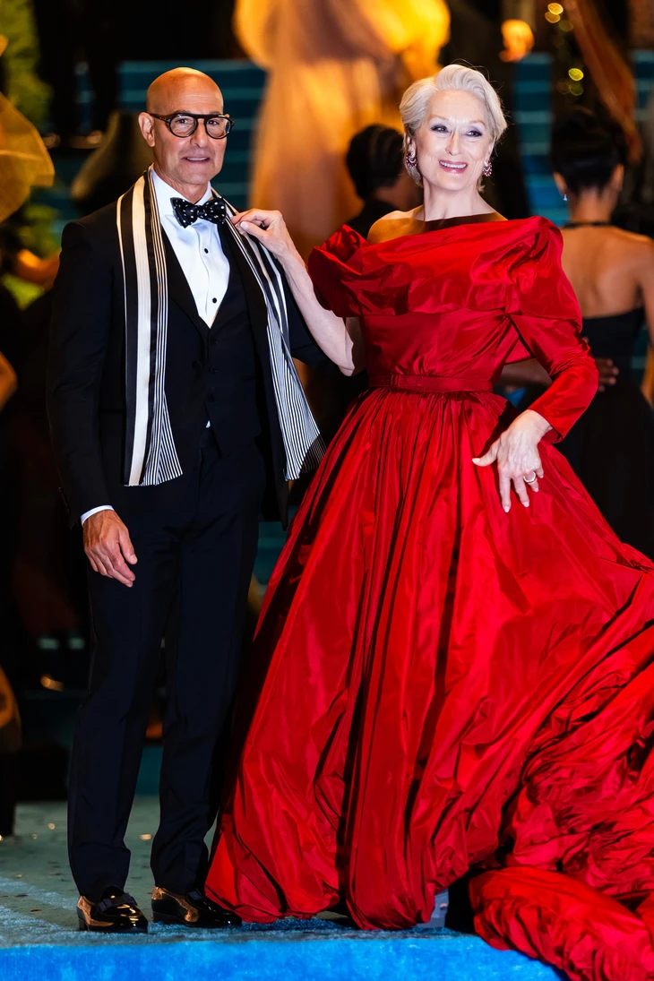 Meryl Streep mang đến vẻ đẹp lộng lẫy cho buổi ra mắt phim tại New York. Bà diện một chiếc áo choàng màu đỏ cam hoàn chỉnh với cà vạt cùng màu thắt lỏng ở cổ áo, được chọn từ bộ sưu tập Thu Đông 2026 của Givenchy. Nữ diễn viên đeo đôi găng tay da thật kiểu opera - Ảnh: Jamie McCarthy