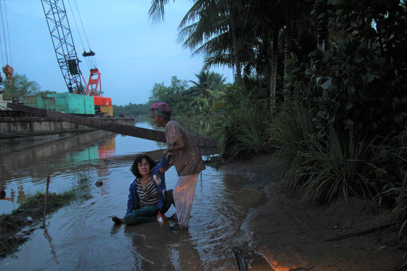 Một người dân bị té ngã trên đoạn đê bao bị ngập nước - Ảnh: MẬU TRƯỜNG