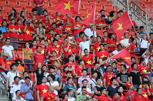 Phóng viên Nguyên Khôi của Tuổi Trẻ đang có mặt tại sân Rajamangala cho biết, trên sân hiện nay có khoảng 200 CĐV VN. Fan Việt Nam vẫy cờ, thổi kèn... tạo nên không khí sôi động trên khán đài.