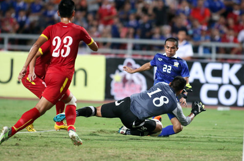 NGUY HIỂM! Phút 62, Việt Nam có pha phản công nguy hiểm ở trung lộ. Mai Tiến Thành chọc khe cho Công Vinh bứt tốc độ thoát xuống nhưng một lần nữa thủ môn Hathairatanakul đã băng ra rất nhanh và phá bóng ngay trước mũi giày của Công Vinh.