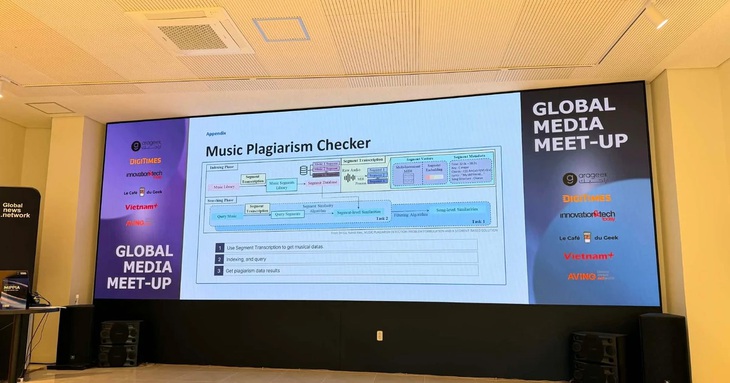 Màn hình thể hiện việc phát hiện đạo nhạc hoặc xác định âm nhạc do AI tạo ra tại sự kiện Global Media Meet-up - Ảnh: TTXVN