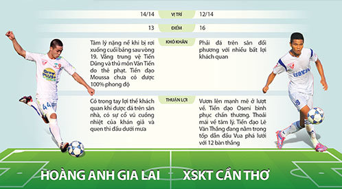 | Cuộc đối đầu hứa hẹn hấp dẫn giữa át chủ bài của hai đội là tiền đạo Nguyễn Công Phượng (HAGL, 5 bàn thắng, trái) và chân sút Lê Văn Thắng (XSKT Cần Thơ, 12 bàn thắng) - Ảnh: N.K. - S.H. - Đồ họa: Tấn Đạt |