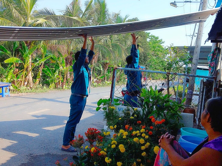 Lực lượng chức năng địa phương hỗ trợ người dân lợp lại mái nhà sau mưa dông bị tốc mái - Ảnh: Đ.T.
