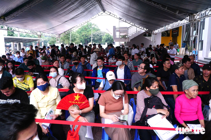 Người Hà Nội xếp hàng nộp hồ sơ mua nhà ở xã hội thuộc một dự án tại khu vực Đông Anh - Ảnh: PHẠM TUẤN