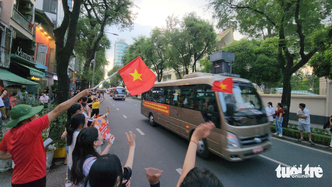 Sau cơn mưa thời tiết mát mẻ nhưng không khí tại đường Lê Duẩn vẫn "nóng hừng hực". Đó là sức nóng tỏa ra từ hàng ngàn trái tim yêu nước, từ sắc cờ đỏ sao vàng - niềm tin, tự hào của dân tộc Việt.