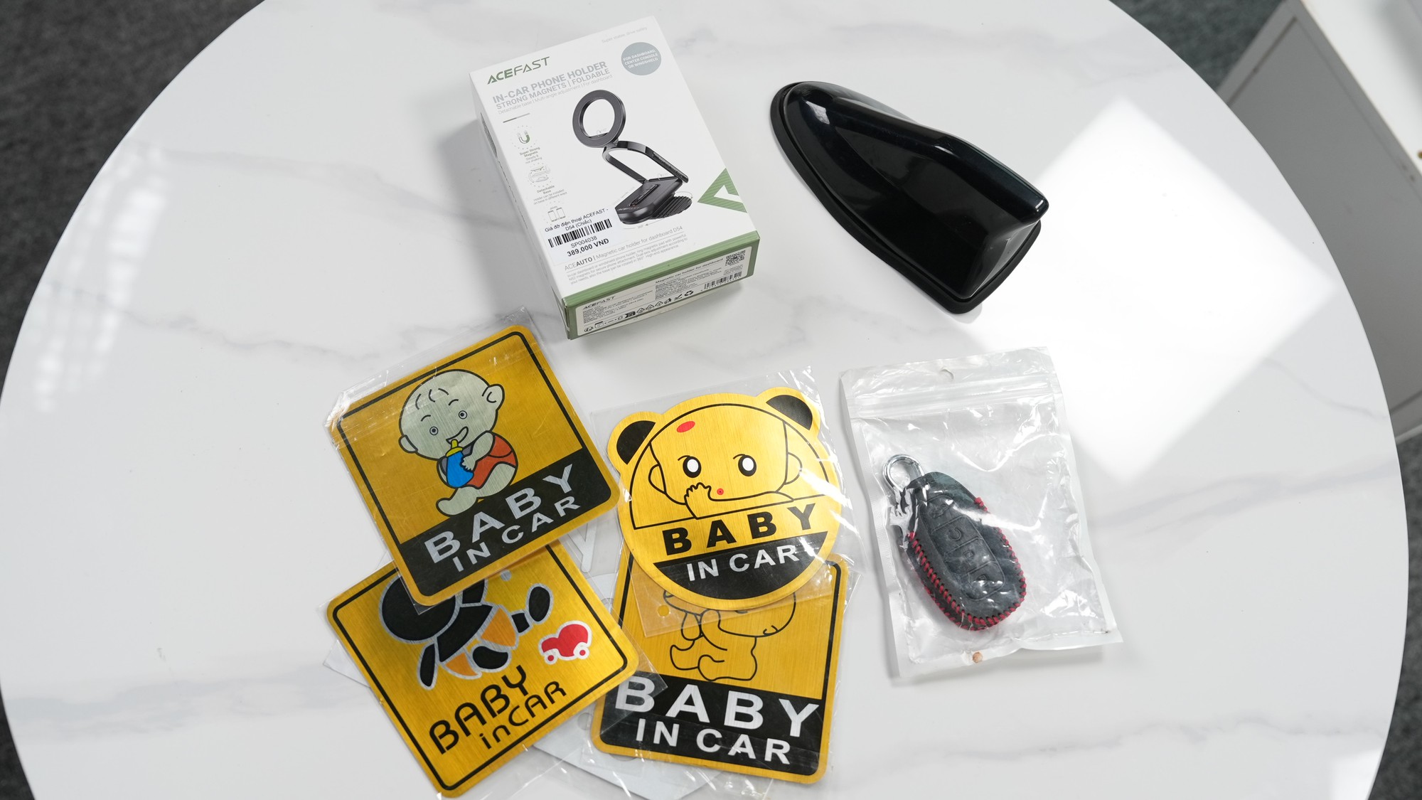 Bao da chìa khóa, sticker dán xe, ăng ten vây cá... là những phụ kiện có thể mua online - Ảnh: THÙY TRAG
