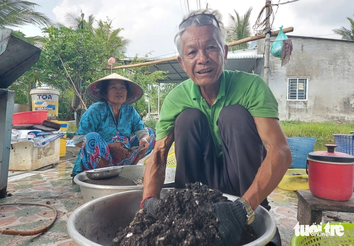 Ông Nguyễn Văn Tùng - người dân nuôi tôm ở ấp Công Sự, xã U Minh Thượng - cho biết sau những cơn mưa trái mùa, ông thường xử lý nước bằng vôi và cho tôm ăn đầy đủ dinh dưỡng để không bị ảnh hưởng đến năng suất - Ảnh: CHÍ CÔNG