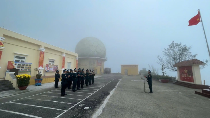 Bộ đội Trạm ra đa 29 chào cờ trong màn sương mù năm mới - Ảnh: B.D.