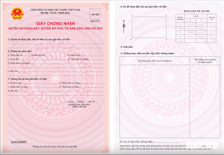 Từ ngày 1-1-2025 bắt đầu áp dụng mẫu sổ đỏ mới gồm một tờ có hai trang, in nền hoa văn trống đồng, màu hồng cánh sen, có kích thước 210mm x 297mm, có Quốc huy, Quốc hiệu, dòng chữ "Giấy chứng nhận quyền sử dụng đất, quyền sở hữu tài sản gắn liền với đất" (16 chữ).