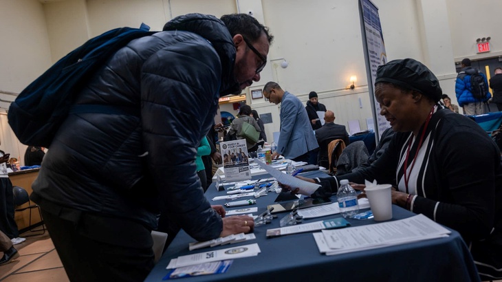 Những người tìm việc tại một hội chợ việc làm ở Harlem, New York (Mỹ) - Ảnh: marketplace.org