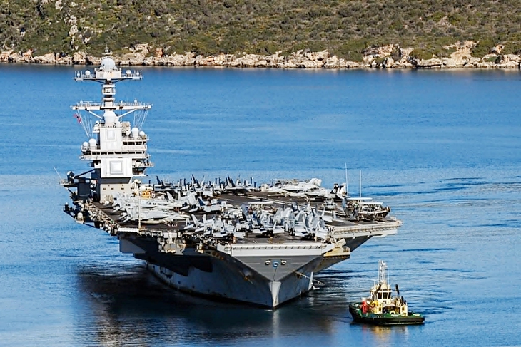 Tàu sân bay USS Gerald R. Ford của Hải quân Mỹ rời vịnh Souda ở Địa Trung Hải hôm 26-2 giữa lúc căng thẳng với Iran - Ảnh: AFP