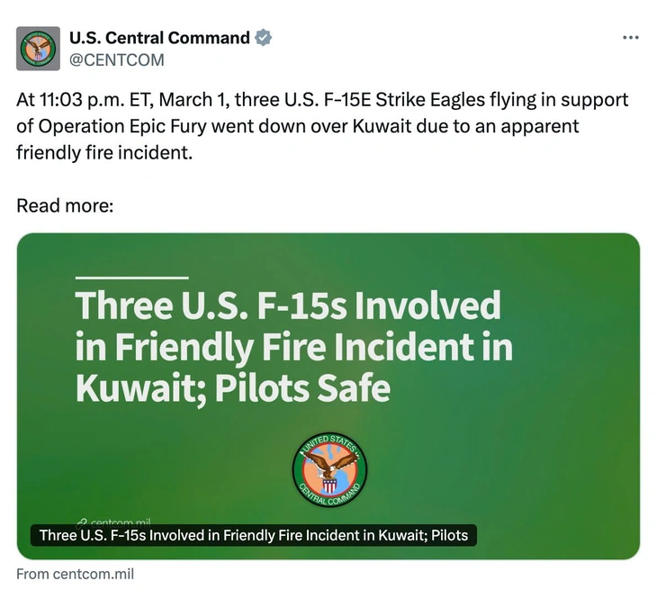 "Vào lúc 23h03 (giờ miền Đông nước Mỹ) ngày 1-3 (11h03 sáng 2-3 giờ Việt Nam), ba tiêm kích F-15E Strike Eagle của Mỹ đang thực hiện nhiệm vụ hỗ trợ chiến dịch Cơn thịnh nộ kinh hoàng đã rơi trên bầu trời Kuwait do một sự cố có dấu hiệu là đồng minh bắn nhầm (friendly fire)", thông báo của Bộ Tư lệnh Trung tâm Mỹ trên X ngày 2-3 cho biết.