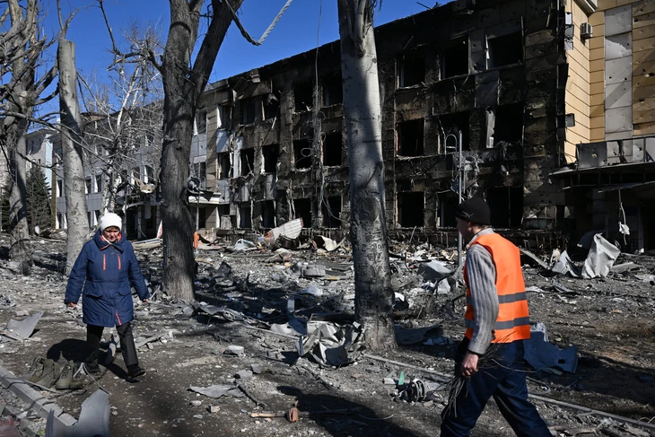 Hiện trường tan hoang sau cuộc tấn công được cho là do Ukraine thực hiện nhằm vào vùng Donetsk ngày 9-3 - Ảnh: AFP