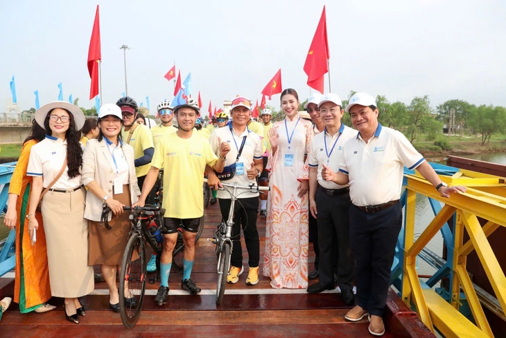 Các đại biểu, vận động viên đạp xe qua cầu Hiền Lương lịch sử - Ảnh: QUANG HÀ