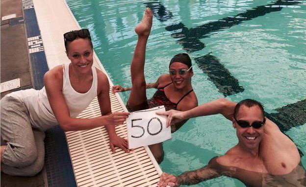 | Bill May (phải) chụp hình cùng các đồng nghiệp nữ. Ảnh: USA Aquatique |
