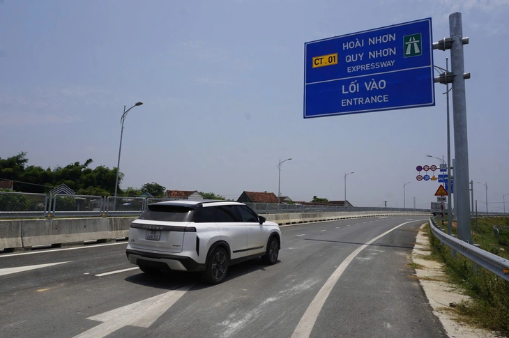 Một xe hơi rẽ vào đường dẫn lên đường cao tốc Hoài Nhơn - Quy Nhơn trưa 29-4 - Ảnh: Q.Đ.