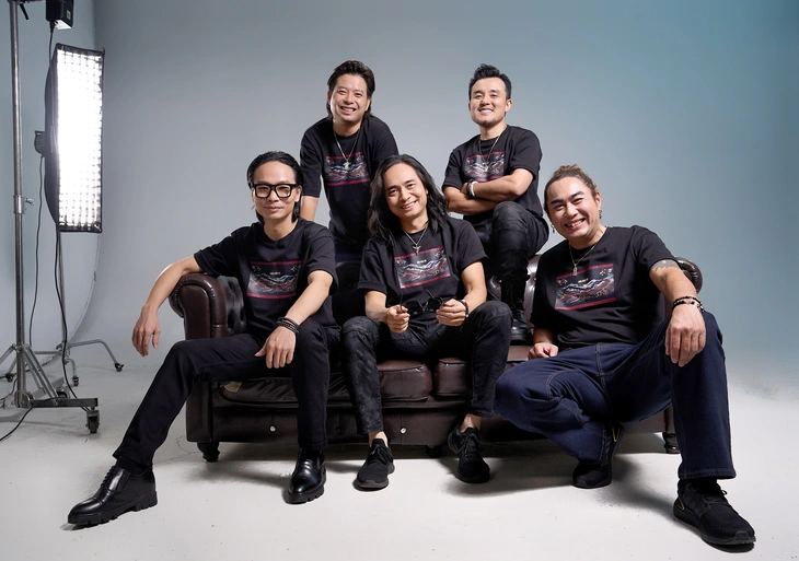 Ban nhạc Bức Tường và ca sĩ Nguyễn Việt Lâm (hàng ngồi bên trái) cùng thể hiện ca khúc Trên đỉnh gió - Ảnh: NVCC