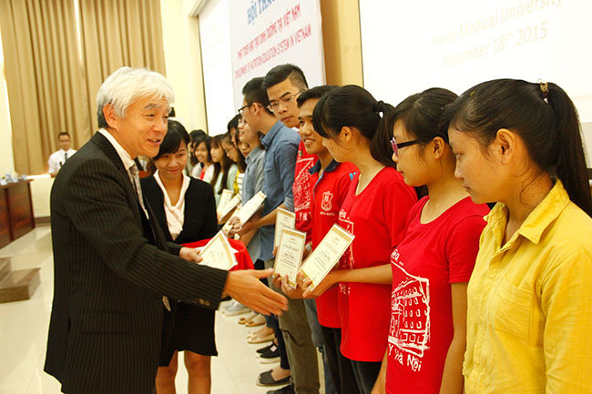 | Ông Hiroharu Motohashi – Tổng giám đốc Công ty Ajinomoto Việt Nam trao 15 suất học bổng cho sinh viên có điểm đầu vào cao nhất. |