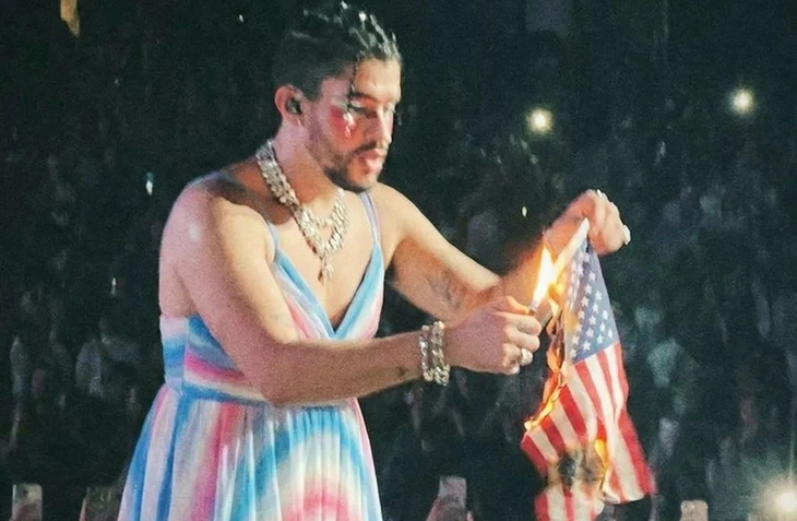 Ngày 8-2, một bài đăng trên Facebook đã chia sẻ hình ảnh cho thấy Bad Bunny, mặc trang phục đầm hai dây sọc trắng, xanh và hồng, đang dùng bật lửa đốt cờ Mỹ.